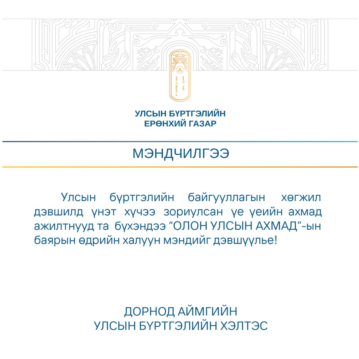 Улсын бүртгэлийн байгууллагын үүсэл хөгжил дэвшилд үнэт хүчээ зориулсан үе үеийн ахмад ажилтнууд та бүхэндээ “ОЛОН УЛСЫН АХМАД”-ын баярын өдрийн халуун мэндийг дэвшүүлье!