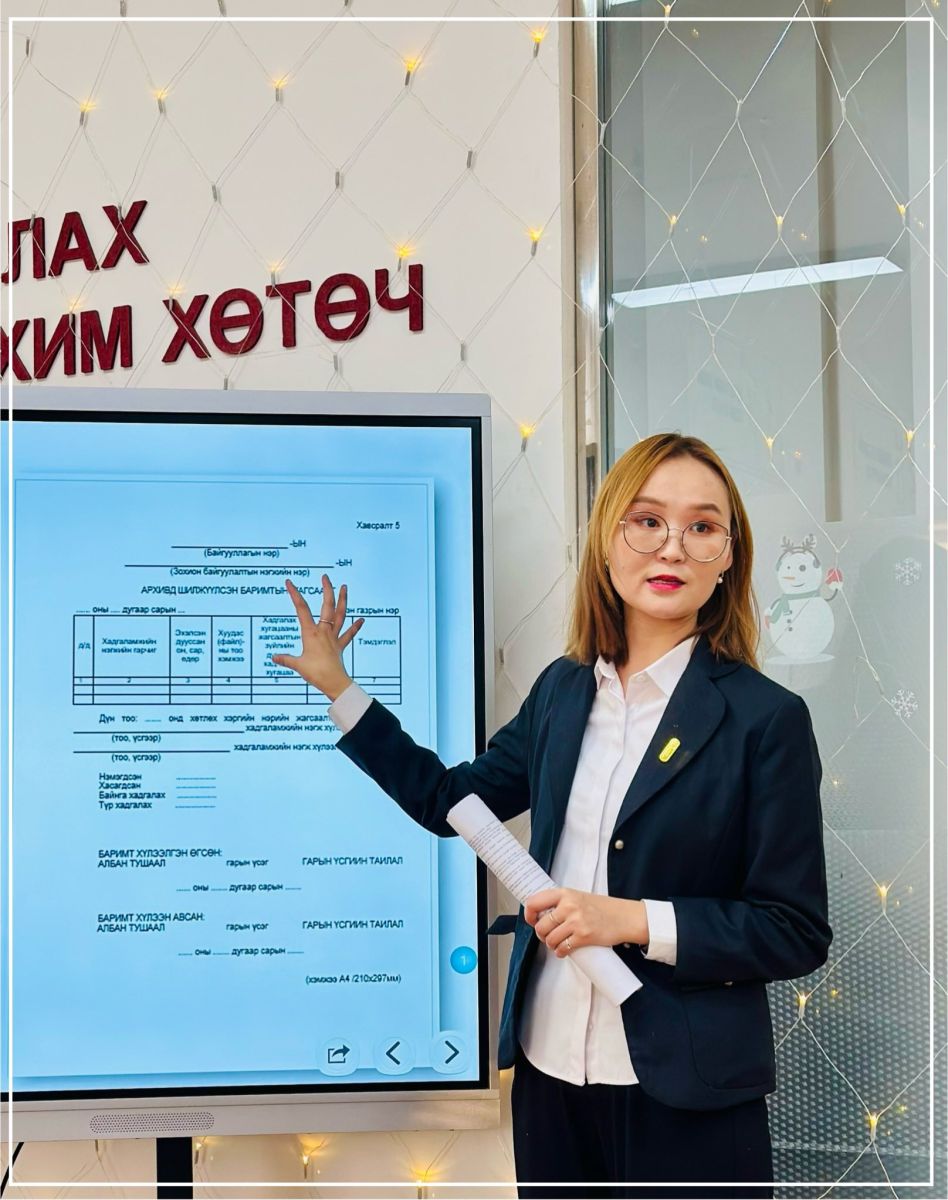 Бичиг хэргийн эрхлэгч, нярав Э.Цолмончимэг нийт албан хаагчдад “Байгууллагын архивд баримт бичиг хүлээлгэн өгөхөд анхаарах асуудал болон баримт бичгийн стандарт”-ын талаарх сургалтыг зохион байгууллаа.