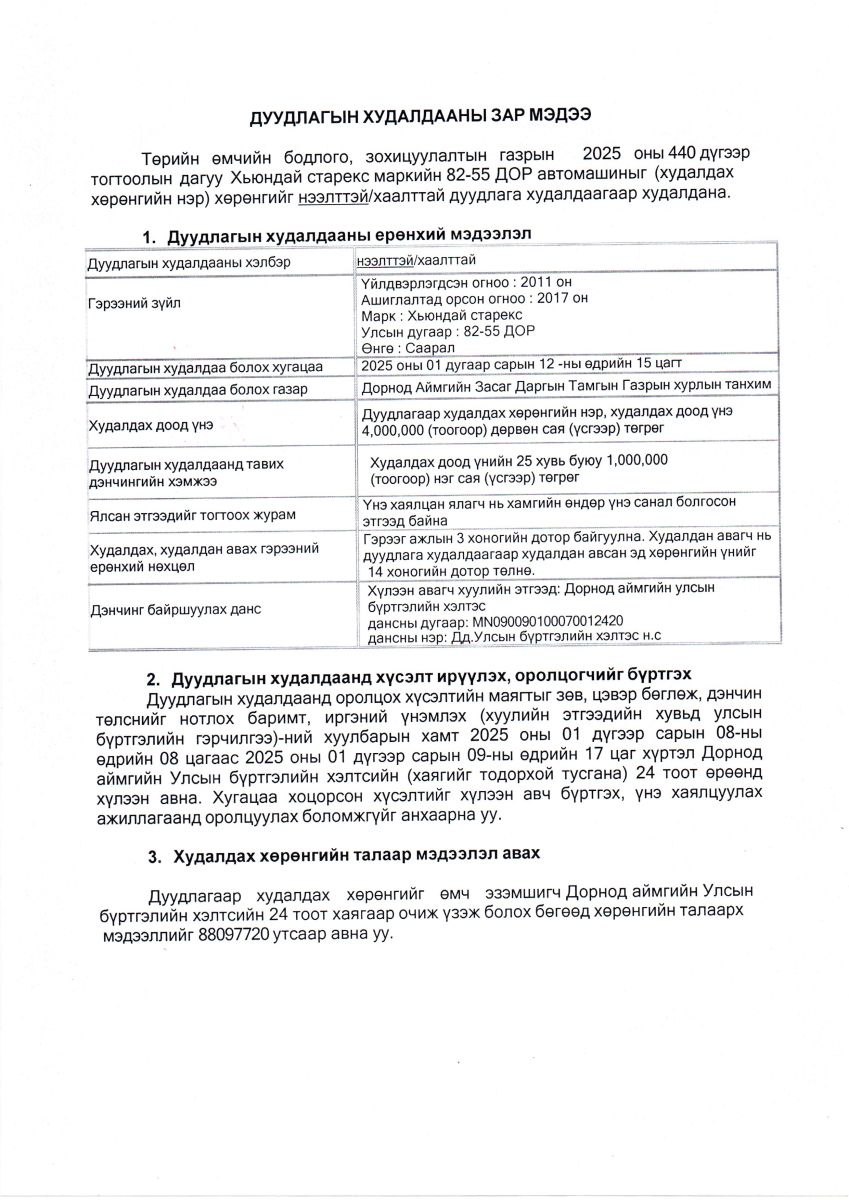 Төрийн өмчийн бодлого, зохицуулалтын газрын 2025 оны 440 дүгээр тогтоолын дагуу Хьюндай старекс маркийн 82-55 ДОР автомашиныг нээлттэй дуудлага худалдаагаар худалдана. Дуудлагын худалдаа 2026 оны 01 дүгээр сарын 12-ны өдрийн 15:00 цагт Дорнод аймгийн Засаг даргын тамгын газрын хурлын танхимд явагдана.